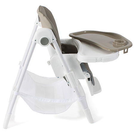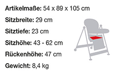 Stabiler und pflegeleichter Hochstuhl mit verstellbarer Sitzhöhe und Rückenlehne sowie verstell- und abnehmbaren Tablett mit Bechervertiefung.